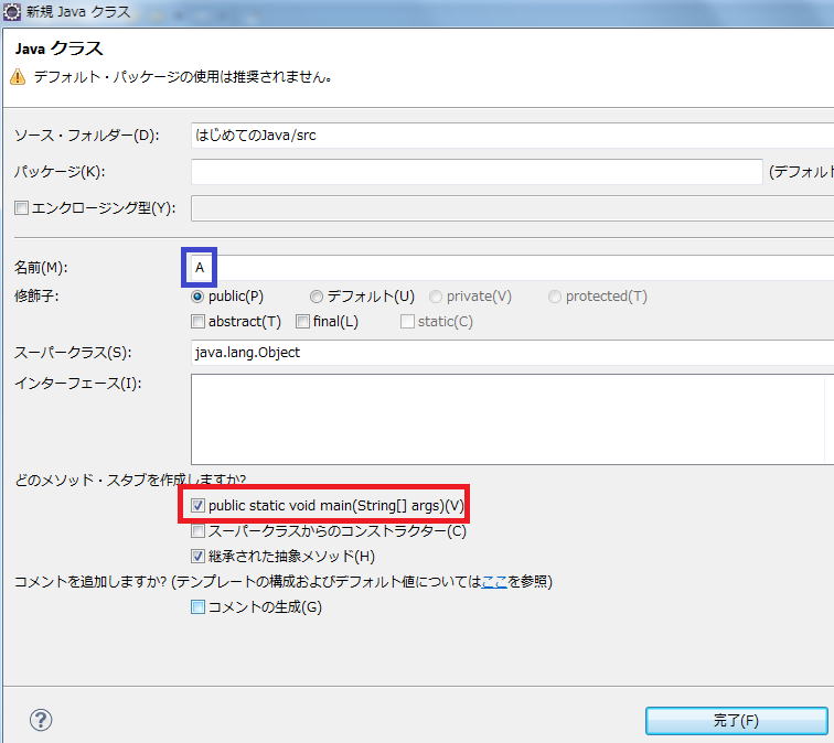 そして、pulic static vodi main(String[] args)(V)にチェックマークを入れ完了ボタンを押します。