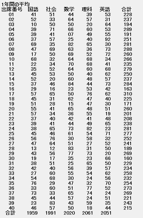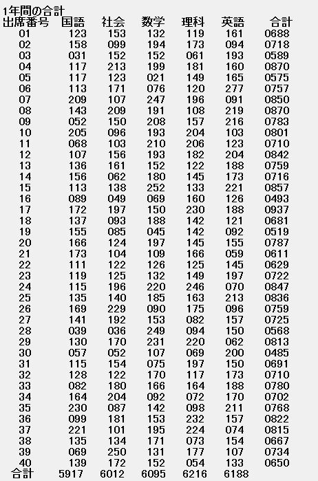 w=w+L"出席番号 国語 社会 数学 理科 英語\n";