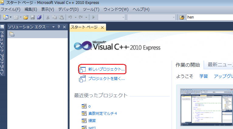 まず、Visual C++を起動してください。そして、新しいプロジェクトをクリックしてください。