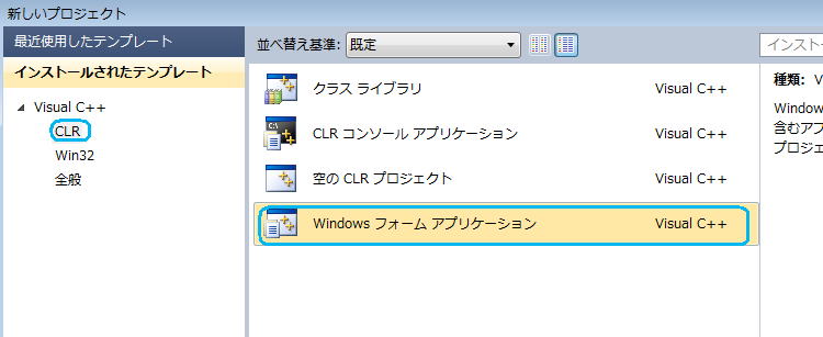 CLRのWindowsフォームアプリケーションを選んできましたが、今回は