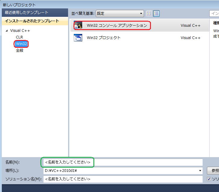 Win32のWin32コンソールアプリケーションを選びましょう。そして、名前のところには今までと同様にaなどと入れていきましょう。