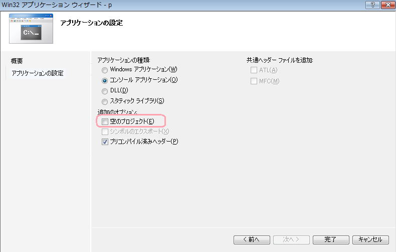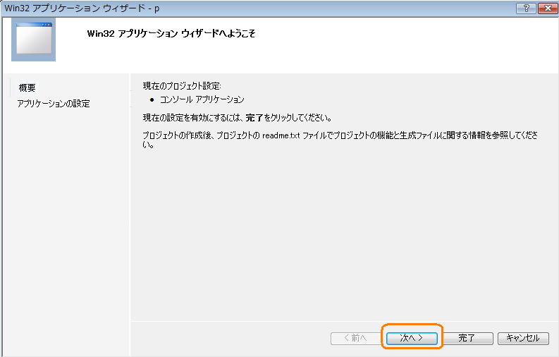 入力できたらOKボタンを押してください。すると、Win32アプリケーションソフトウィザードが開きます。