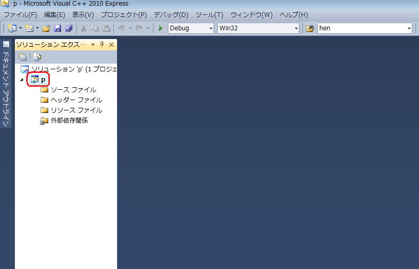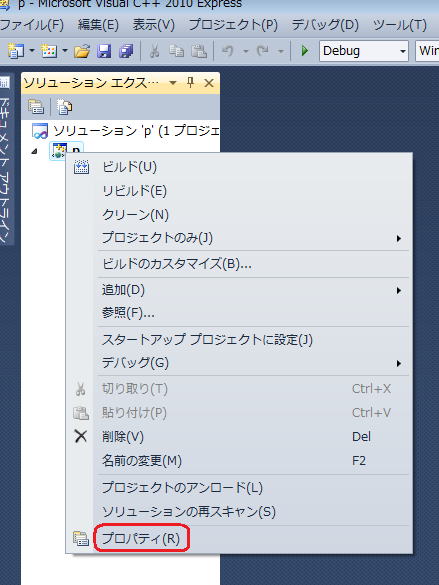 C++/CLI(C++の拡張版)が使えるようにするため、p(自分でつけたプロジェクト名=ソリューション名)を右クリックして