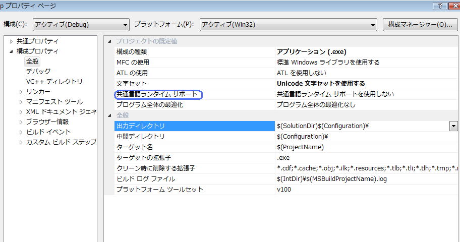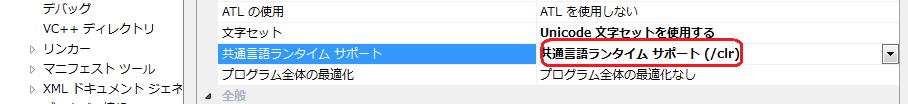 共通言語ランタイムサポート(/crl)になるようにします。共通言語ランタイムサポートにならない場合は、何回かダブルクリックを繰り返した下さい。