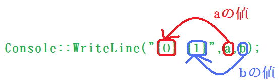 Console::WriteLine("{0} {1}",a,b);の働きを図にすると、