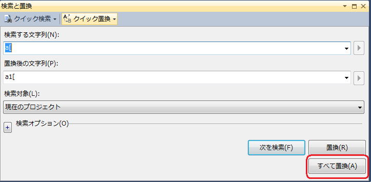 図のように置換後の文字列をa1[、検索対象を現在のプロジェクトとして、すべて置換を選択します。