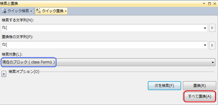置換後の文字列をf2(、検索対象を現在のブロックとして、すべてを置換します。