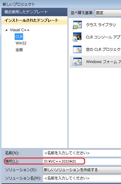 新しいプロジェクトの作成の際に、場所をD:\VC++\d1としておくと、ソリューション名でD:\VC++\d1の中にフォルダが作られ、