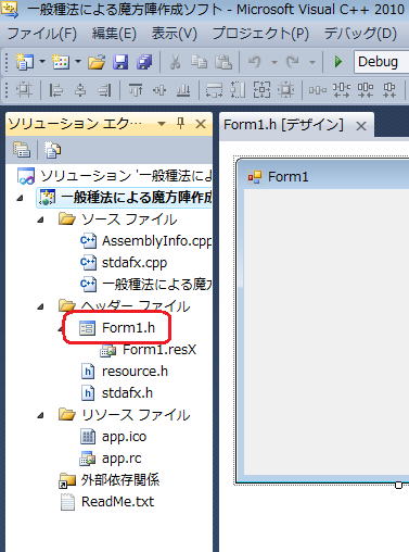 まずVC++2010を起動して、今回作った『特殊種法による魔方陣作成ソフト』を開いてください。