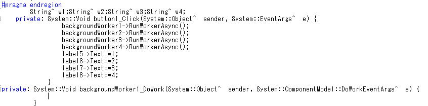 と自動的にSystem::Void backgroundWorker1_DoWork(System::Object^ sender, System::ComponentModel::DoWorkEventArgs^ e) ができます。