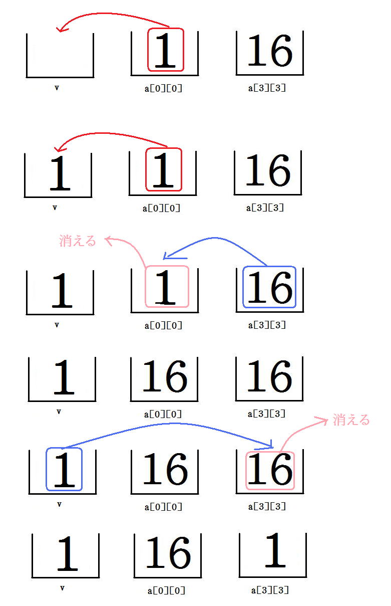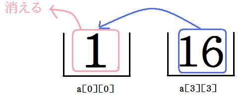 a[3][3]=a[0][0];はまったく意味がないことがわかります。実は、1を消さないためには、もう一つ箱を用意しておく必要があります。